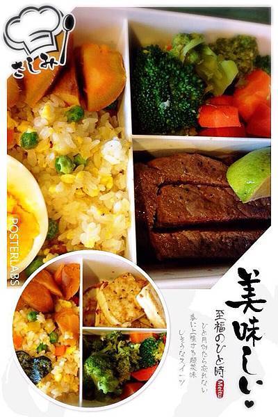 莎莉今天便當餐:蛋炒飯:小火炒四色冷凍蔬菜+冷飯+牛奶炒蛋 (義大利香料,胡椒)蒸地瓜:地瓜直接蒸 水煮蔬菜:花椰菜 紅蘿菠 切塊水煮 (鹽,少許香油)乾煎豆腐:豆腐 乾煎 (鹽少許)水煮蛋肉食者:水煎牛排 :就是放少許水 煎牛排 小火 煎至四週外皮都熟了,然後關火 悶煮一下即可。 牛排不要過熟,七分最好吃。(調味料請在下鍋前用鹽巴 擦一下牛排兩面即可)鬥士,你餓了嗎?我超餓~所以~先開動囉^^~