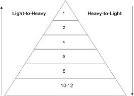 A)上升輕到重金字塔,每組數中逐漸的增加重量及減少反覆的次數。