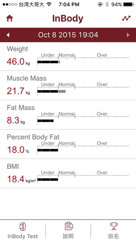 於是就顯示出我的體重,肌肉量,體脂肪還有BMI等等。
